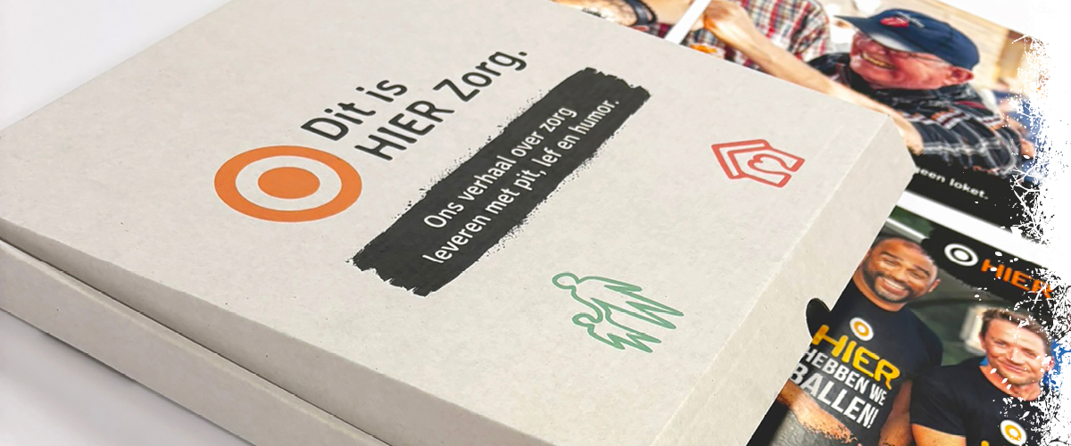 Deze doos past bij de club zorgprofessionals die HIER vormen. Inclusief stickers die letterlijk én figuurlijk blijven plakken. Bij HIER zeggen ze het zoals het is: soms recht voor z’n raap, soms met een knipoog, maar altijd vanuit het hart.